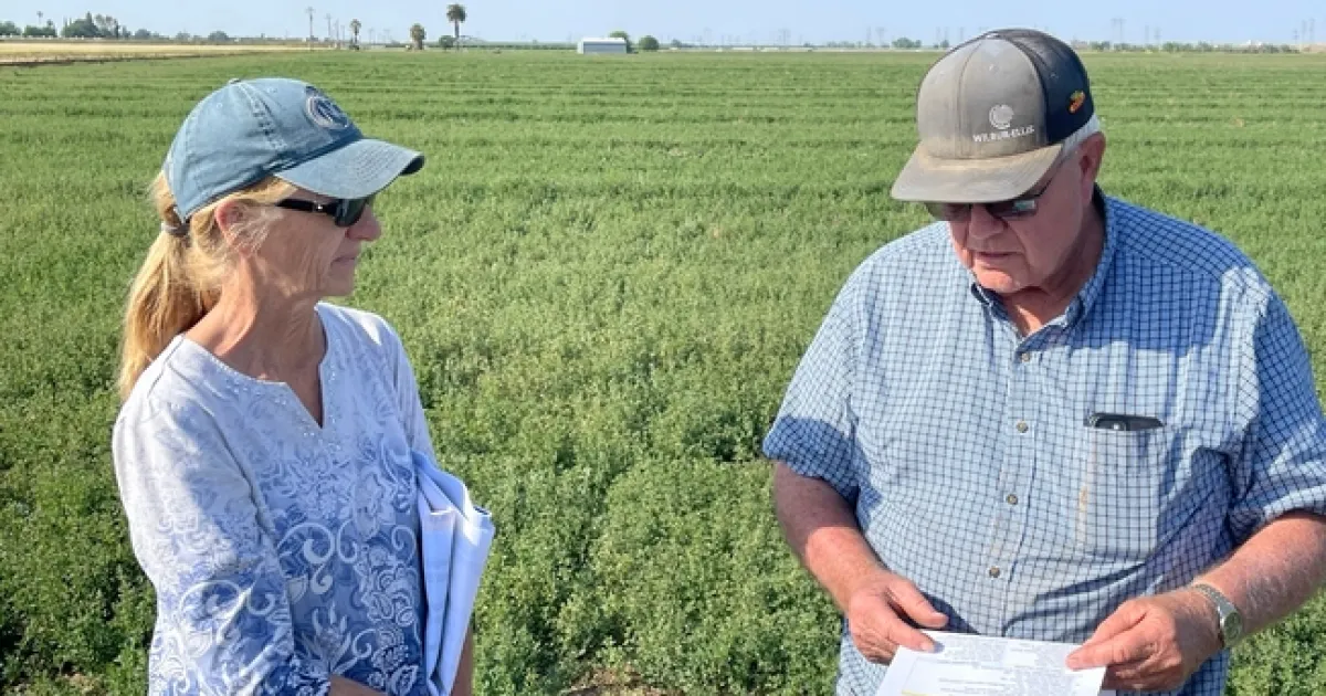 Figure 3. UCCE Advisor Rachael Long (left) and grower Ron Tadlock consult on one of his drought stressed fields in Yolo County, CA, April, 2022. The soil has become very dry. Since at least 3 weeks remain before the first harvest, he elected to water the field to provide water for the upcoming hot periods. It's important to 'fill the deep profile' for alfalfa on good soils to maximize early yields, and provide residual moisture for additional cuttings.