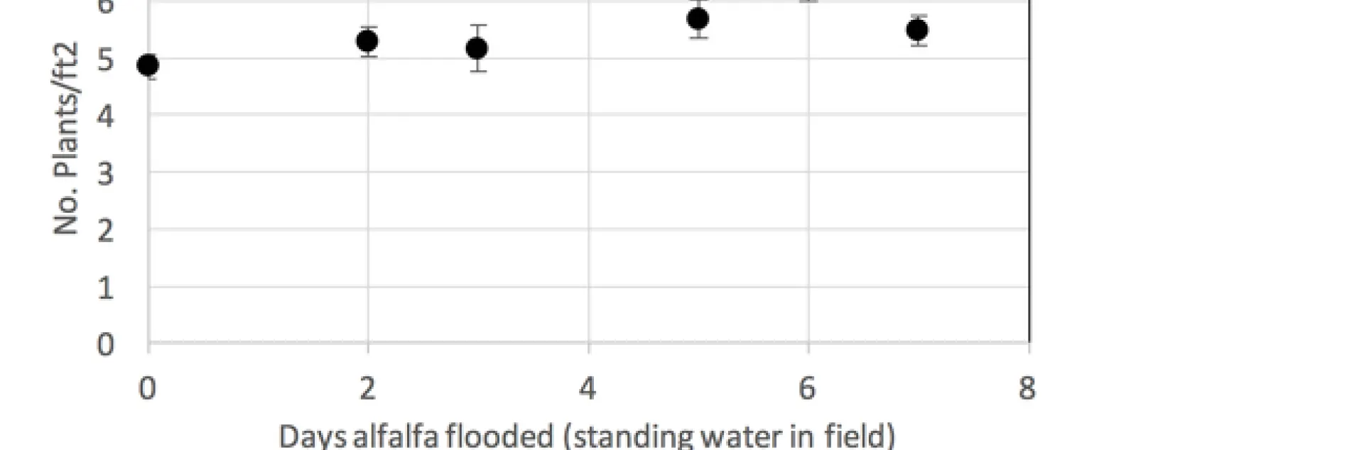 When alfalfa is actively growing and inundated by flood waters, it does not tolerate standing water, especially over the crowns. In a study in the Sacramento Valley in 2017, an alfalfa field was monitored for yield and stand persistence after flooding in late February (see photo of flooded alfalfa stand). Yields and stand counts were taken in April, June, and August that same season. Where water sat for 2-days, the stand recovered. However, where water sat for 3 to 5-days, yield declined by 20%; after 6 to 7-days of flooded conditions, yields declined by 40% by August (see Fig. 1).