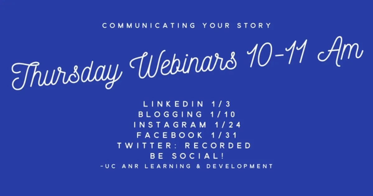 3. Be a lifelong learner: With a series of informative ANR Learning Development webinars coming your way nearly every Thursday from 10 a.m. to 11 a.m., this is one resolution that will be easy to keep! LinkedIn: 1/3/19; Blogging Basics 1/10/19; Instagram: 1/24/19; Facebook: 1/31/19. Creating a Communications Strategy: daily half-hour webinars with “homework” and “office hours” during the week of 2/4-2/8/19. Webinar details at https://ucanr.edu/sites/Professional_Development/Monthly_WebANRs.