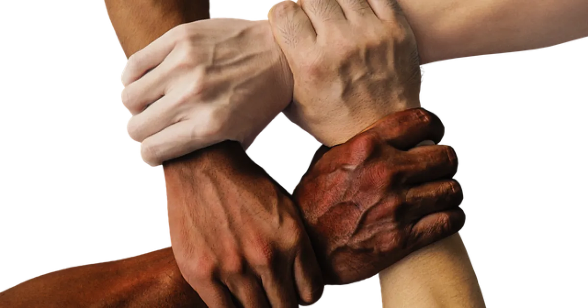 Four hands of light to dark skin color grip the wrist of another to form a closed link.