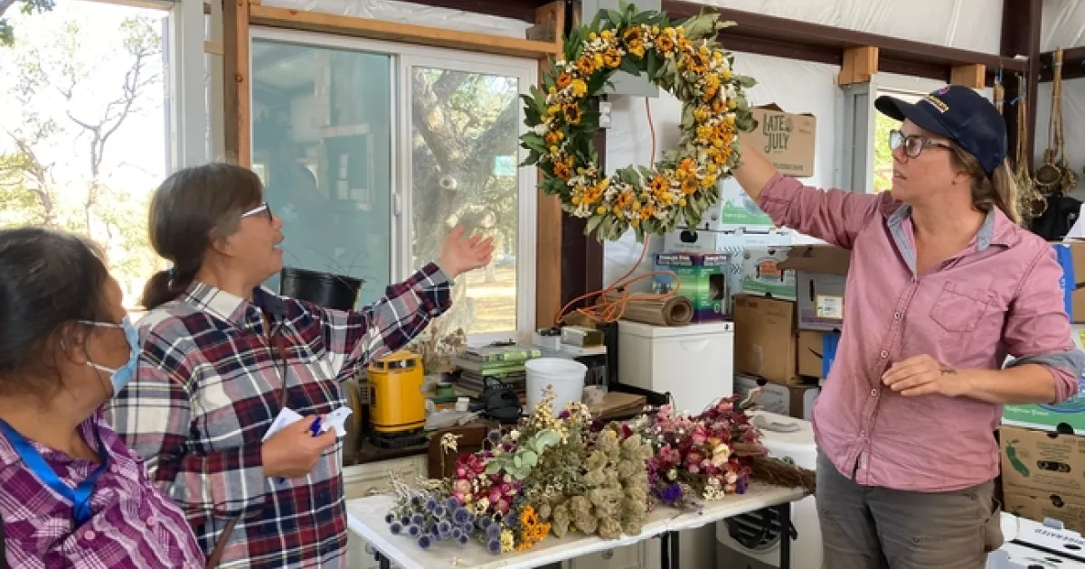 The farmers met at the UCCE Sacramento County office, then traveled by bus to Winters to meet walnut grower Craig McNamara at Sierra Orchards, who talked about the benefits of hedgerows. Their second stop was Rainwater Farm, a flower farm owned by Lauren McNees, former UC ANR program and event specialist, and her husband Lee.
