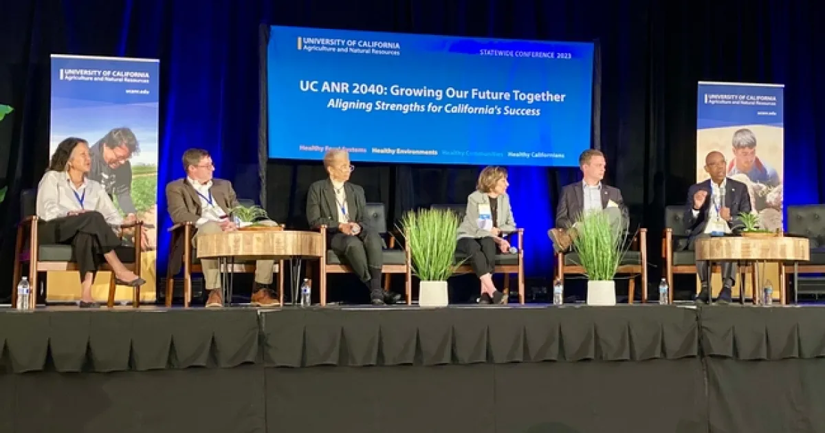 UC President Michael Drake; Jaron Brandon, Tuolumne County supervisor; Walt Duflock, Western Growers vice president of innovation; Paula Daniels, co-founder, chief of What's Next and chair of the board of the Center for Good Food Purchasing; and Sharon Nance, retired USDA Natural Resources Conservation Service assistant state conservationist; shared their perspectives on opportunities for UC research and extension during a panel discussion moderated by Ross.