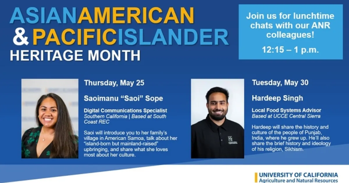 In celebration of Asian American Pacific Islander Heritage Month in May, two of our colleagues generously shared their stories and cultures with the UC ANR community during lunchtime webinars.