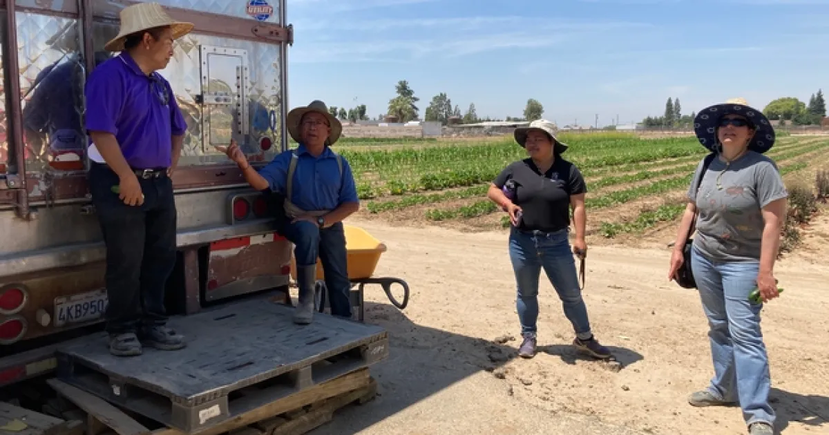 The Southwest Regional Food Business Center provides direct business technical assistance to small- and mid-sized food and farm businesses. From left, Michael Yang, Fresno County grower, Lilian Thaoxaochay and Ruth Dahlquist-Willard discuss produce cooling unit.