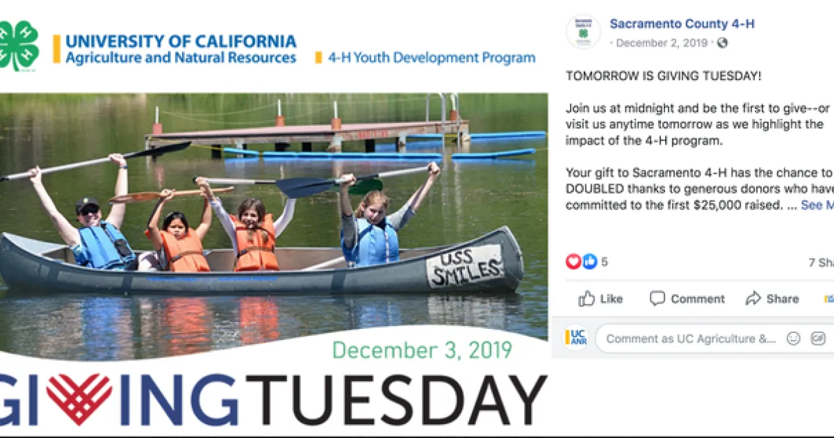 In addition to these All Stars, we want to thank the Statewide UC Master Gardeners and 4-H teams for being “Perfect Partners” in working to promote Giving Tuesday across the state. And we recognize the President's Advisory Commission, senior leadership and the 4-H Foundation Board for being “Match Makers” and giving $40,000 in incentive funds to motivate and double donor dollars.