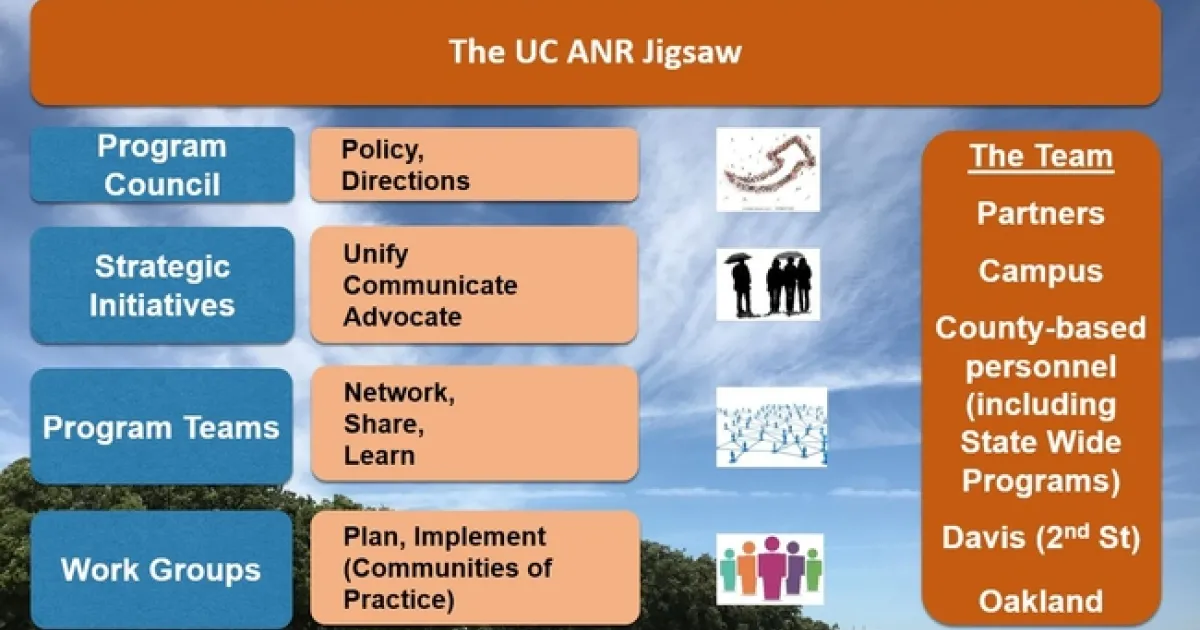 Our UC ANR Jigsaw consists of 50+ workgroups (formal and informal), 18 (active) Program Teams and five Strategic Initiatives (SI), which all have a role to play in helping us connect and communicate.
