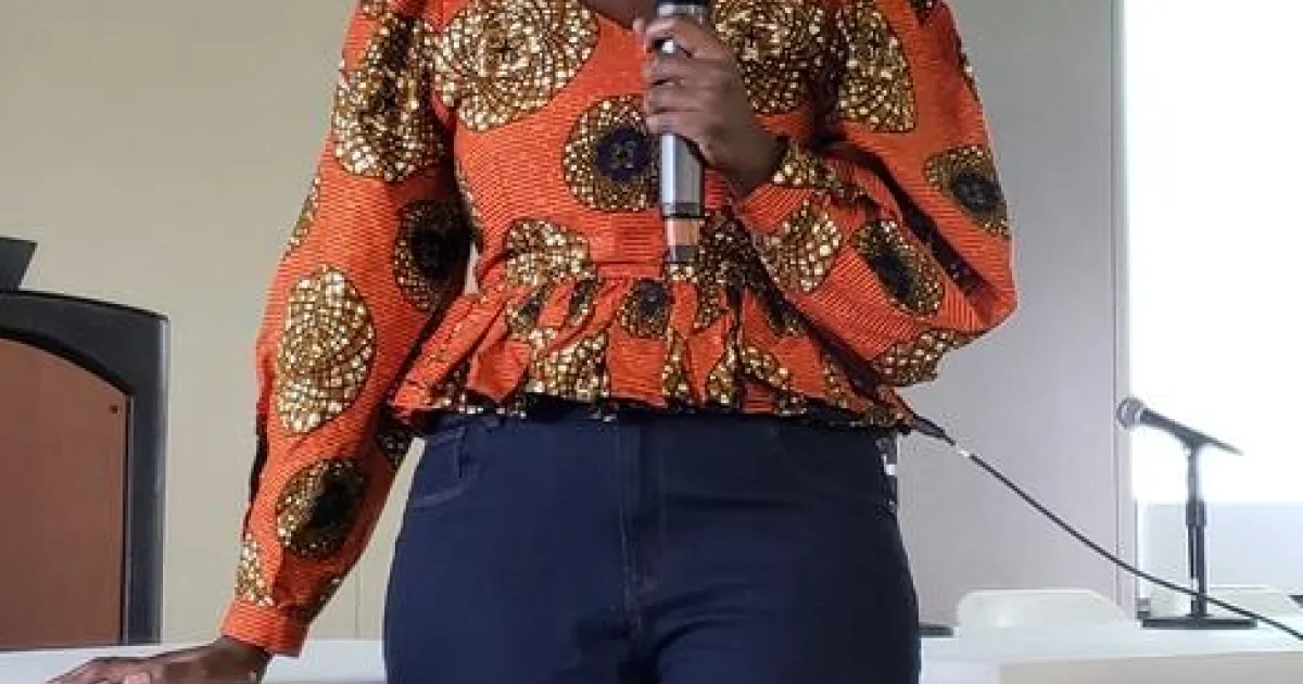 Woman wearing an orange print blouse speaks into a handheld mic.