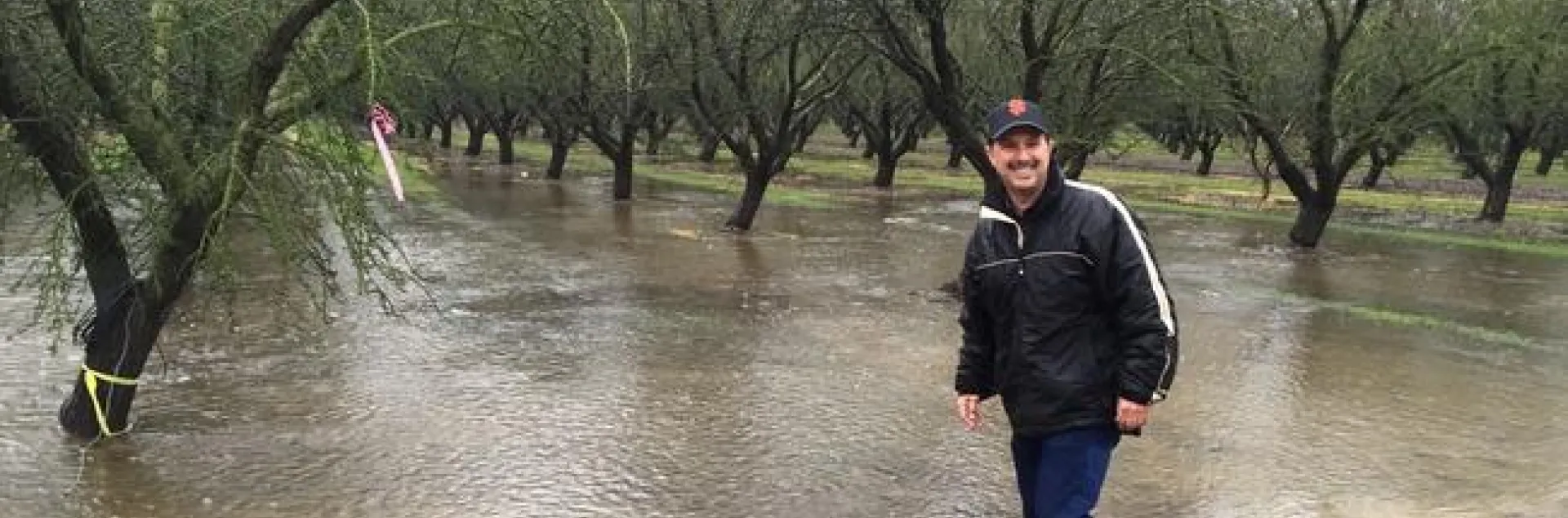 Roger smiles as he stands in a flooded dormant almond orchard