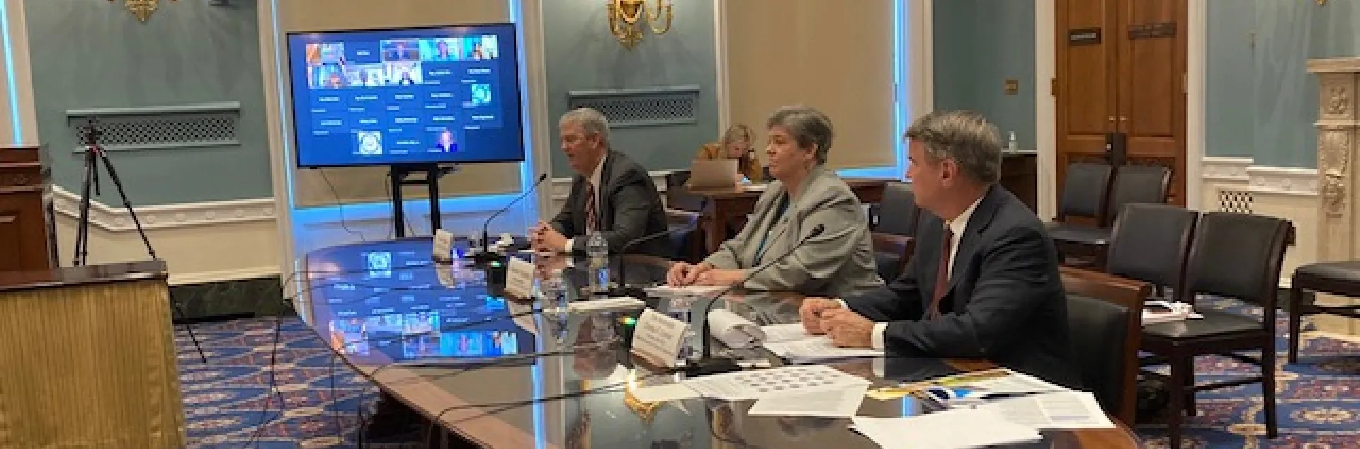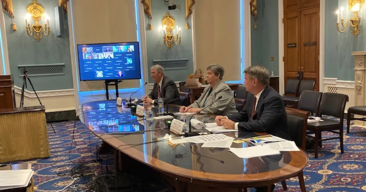 Glenda Humiston sits at a large oval table flanked by two men in dark suits. At one end of the table is a computer screen showing images of people joining the meeting via Zoom.