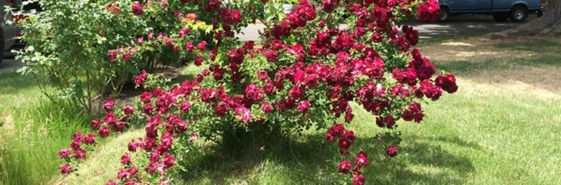 It's rose season in the Owens Valley. Every yard in my neighborhood is full of blooms. Among all the cheery white, pink, yellow and red blossoms atop nice straight stems you can often find our most common cultivar of rose, 'Dr. Huey,' arching its long, weedy neck up and then back toward the ground with a heavy load of dark red blooms.