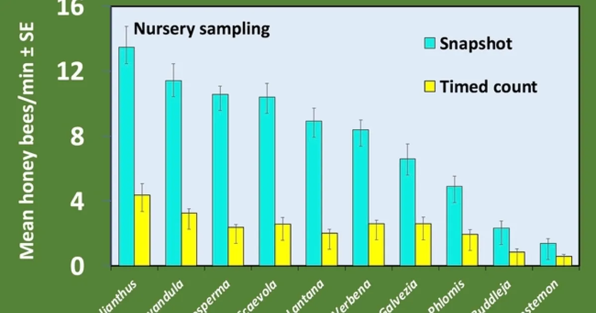 In our attractiveness studies the Southern CA team used timed counts, while the Northern CA team used a snapshot count method (1). This technique consists of 20 second quick counts of every plant that is repeated three times in succession rather than a single 3-minute timed count. The snapshot count is faster to complete and more readily worked into the day of an otherwise busy nursery employee.