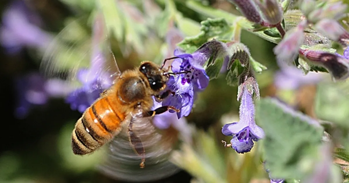 A honey bee buzzing in a patch of catmint. (Photo by Kathy Keatley Garvey)