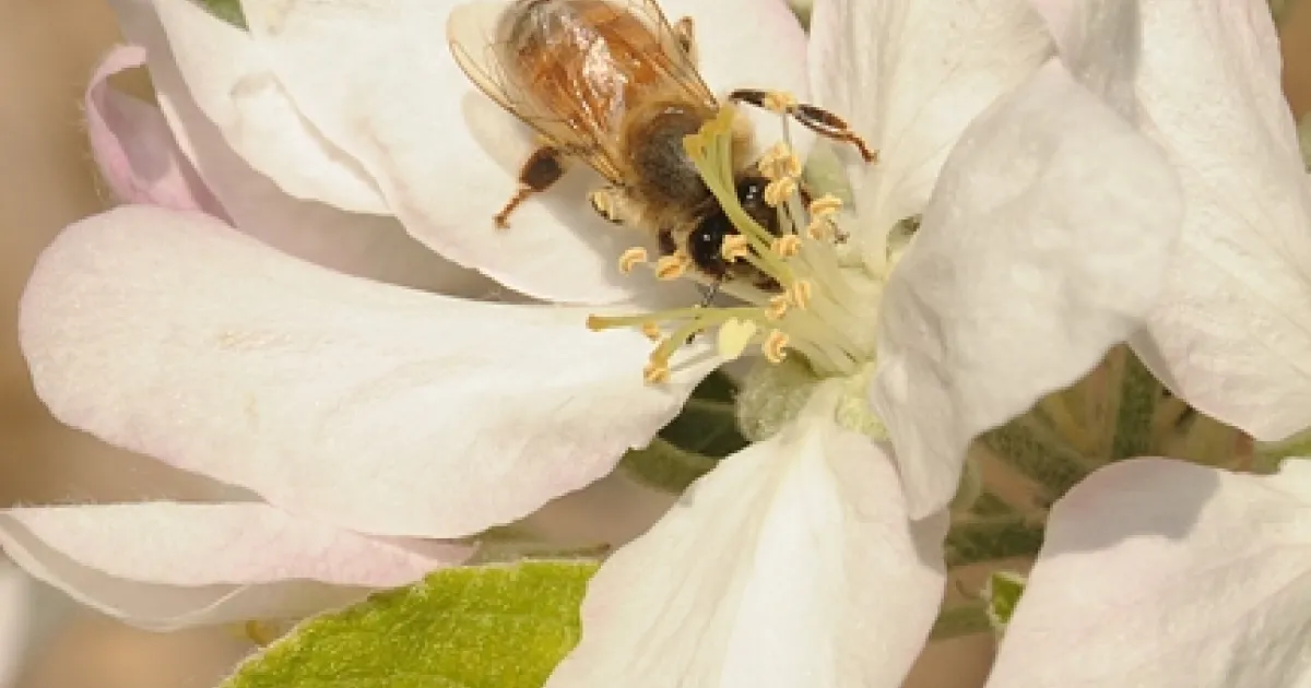 Honey bee on an apple blossom. (Photo by Kathy Keatley Garvey)