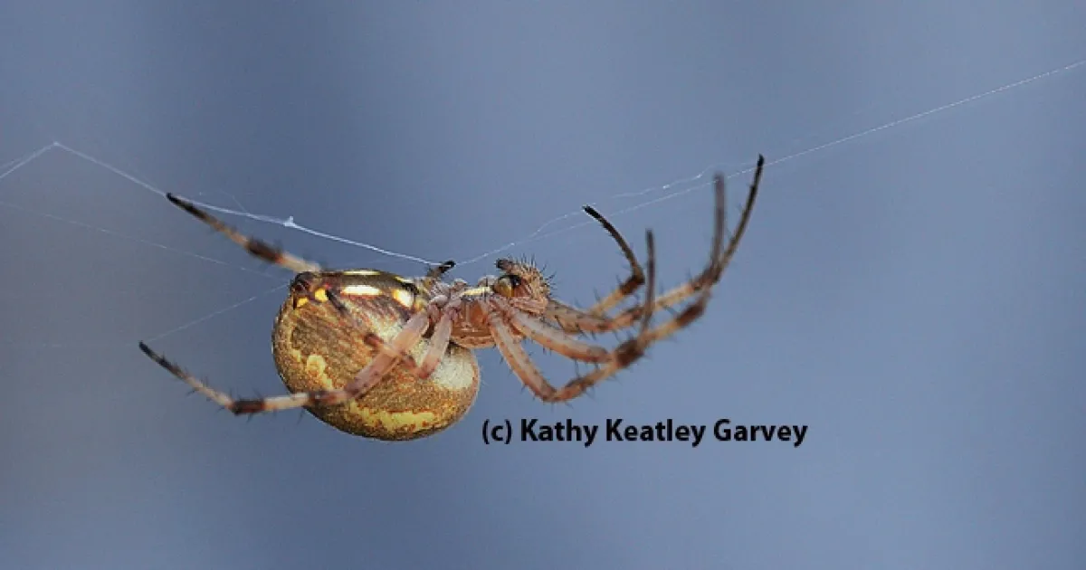 This orb weaver (below) is a western spotted orb weaver, Neoscona oaxacensis, as identified by senior museum scientist Steve Heydon of the Bohart Museum of Entomology at the University of California, Davis. Notice the round abdomen and the spots.
