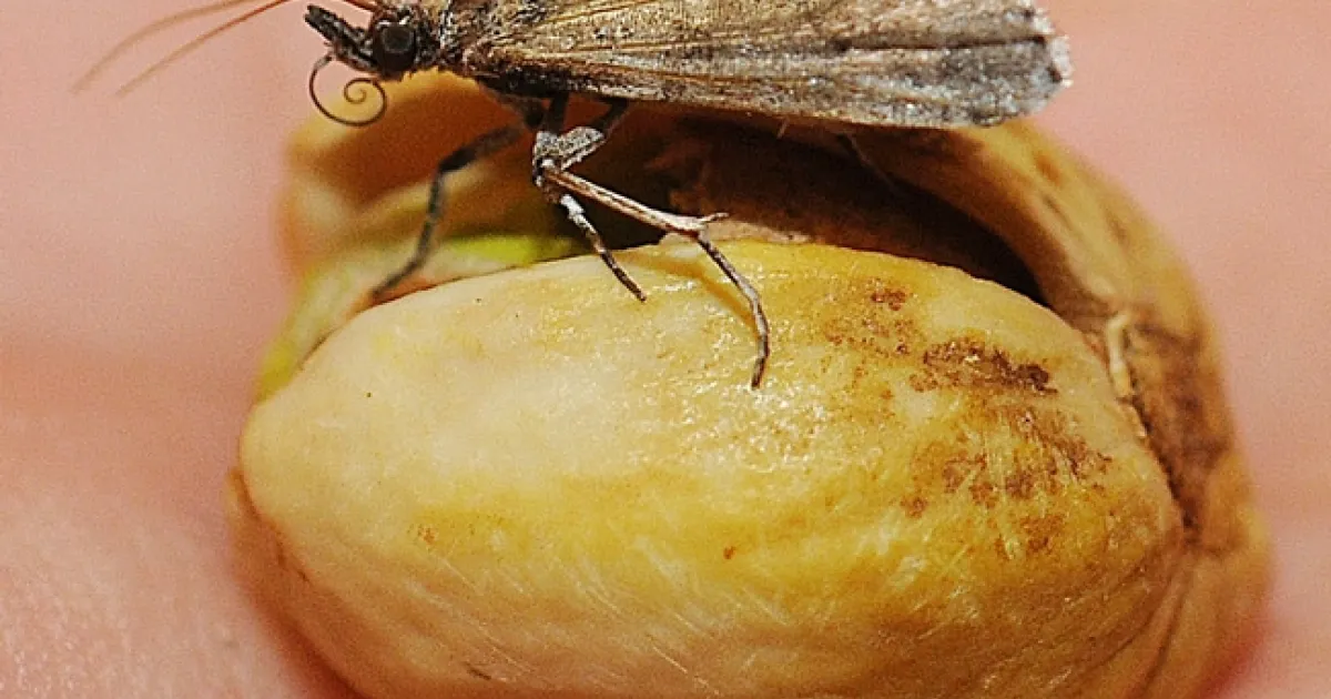 Navel orangeworms lay their eggs in almonds, pistachios and walnuts, with the resulting caterpillars (larvae) causing major damage. This is an adult on a pistachio. (Photo by Kathy Keatley Garvey)