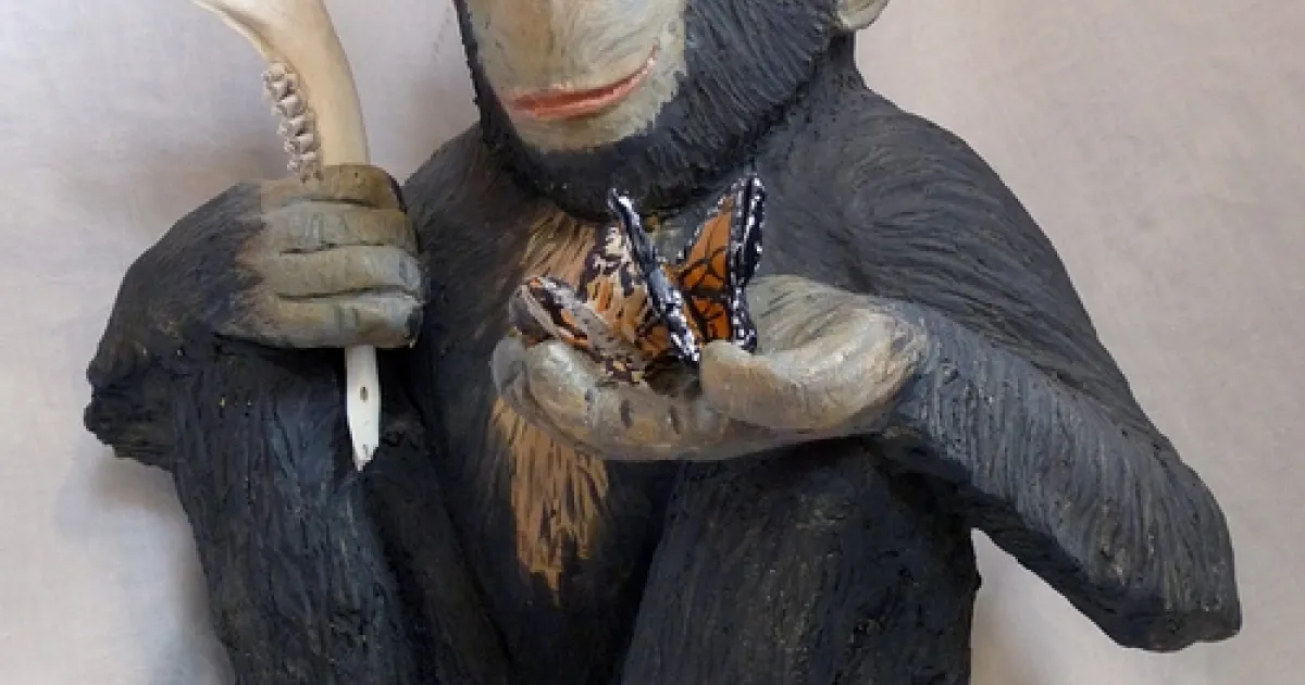 A chimpanzee holds a monarch butterfly in a ceramic art work titled “Darwin.”