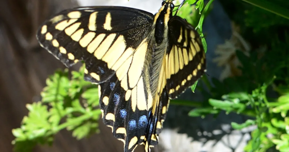 You'll see the anise swallowtail around its host plant, fennel, Foeniculum vulgare, a weed with a licorice aroma. Anise swallowtails breed on the anise and poison hemlock, Conium maculatum, Shapiro says.