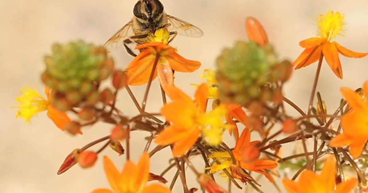 We spotted this drone fly last Sunday sipping nectar on our bulbine (Bulbine frutescens). The plant is known as a bulbine, typically meaning a bulbous plant, but Bulbine frutescens has no bulb.