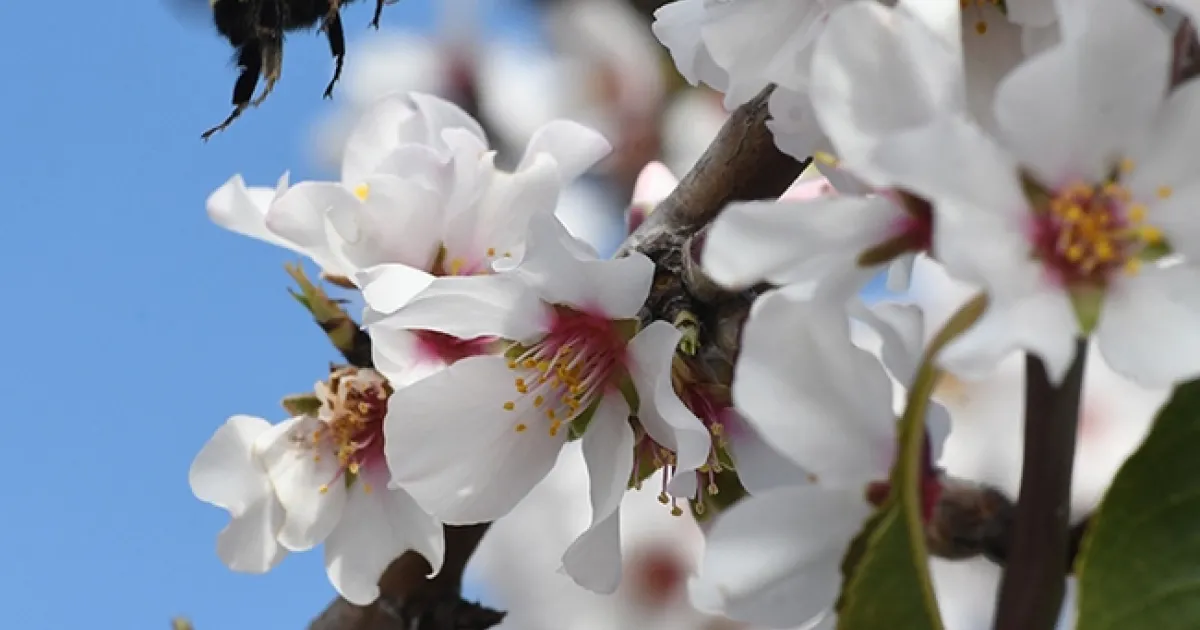Bumble bees foraging on almond blossoms.