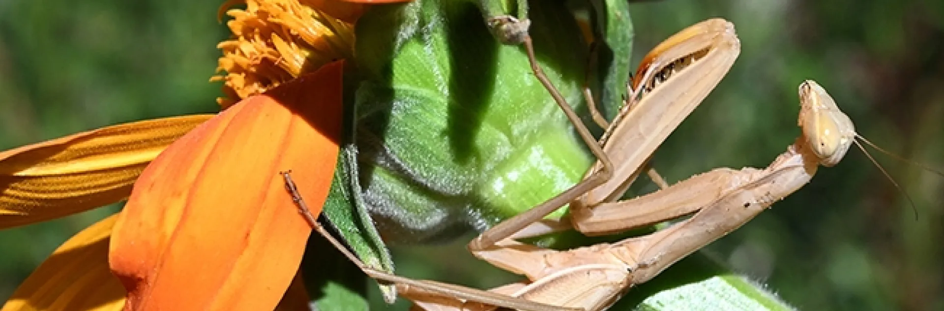 So here's this praying mantis, a female Mantis religiosa, tucked beneath a Mexican sunflower, Tithonia rotundifola, in a Vacaville garden.