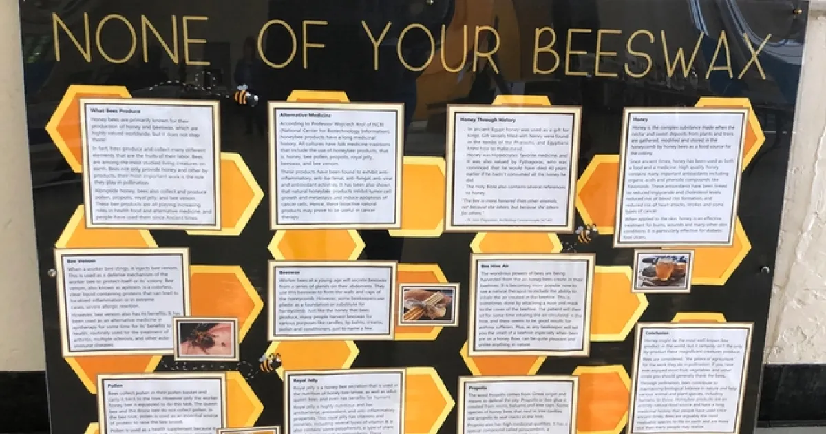 In his project, Anenson explained what bees produce. He zeroed in on bee venom, pollen, beeswax, royal jelly, honey, propolis, and also alternative medicine, history of honey, and bee hive air. Anenson concluded: "Honey might be the most well-known bee product in the world, but it certainly isn't the only by-product these magnificent creatures produce. Bees are considered 'the pillars of agriculture' for the work they do in pollination. If you have ever enjoyed most fruit, vegetables and other crops, you should generally thank the bees. Through pollination, bees contribute to maintaining biological balance in nature and help various animal and plant species, including humans, to thrive. Honeybee products are an entirely natural food source and have a long medicinal history that people have used since ancient times.Bees are arguable the most invaluable species to life on earth and are more vital than many people may realize."