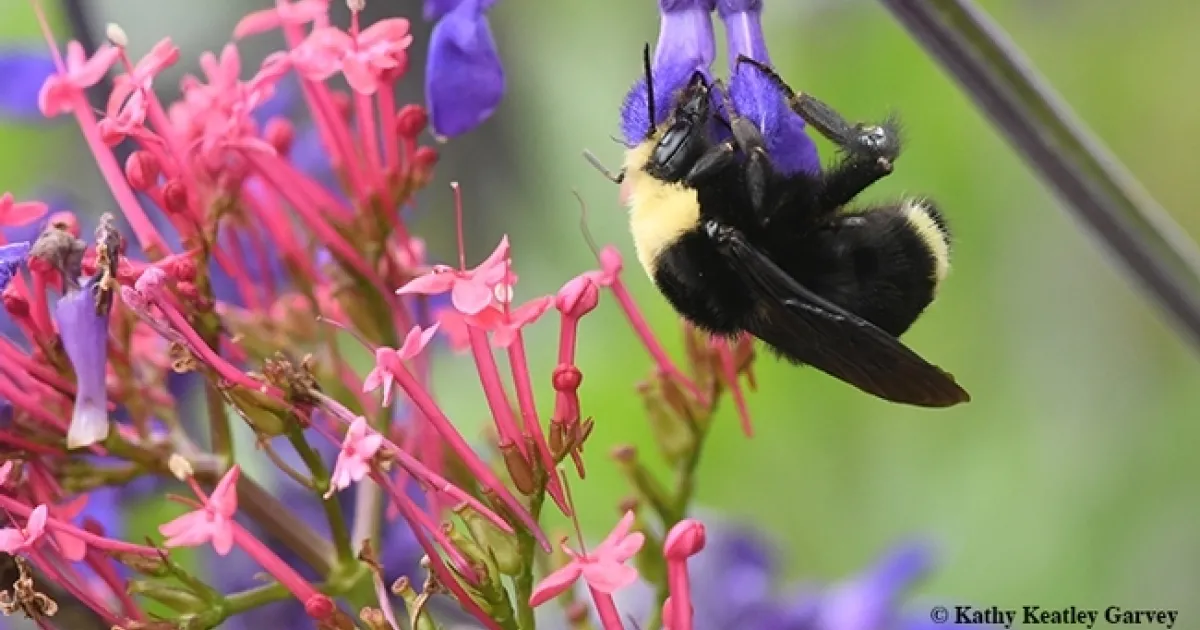 We captured this image several years ago of a queen bumble bee, Bombus vosnesenskii, nectaring on a spiked floral purple plant, Salvia indigo spires (Salvia farinacea x S. farinacea). She had just emerged from her winter hibernation on a sunny day in November. The site: the Sonoma Cornerstone pollinator garden of Kate Frey. She's the co-author of The Bee-Friendly Garden (with UC San Francisco professor Gretchen LeBuhn), and a world-class garden designer and pollinator advocate.