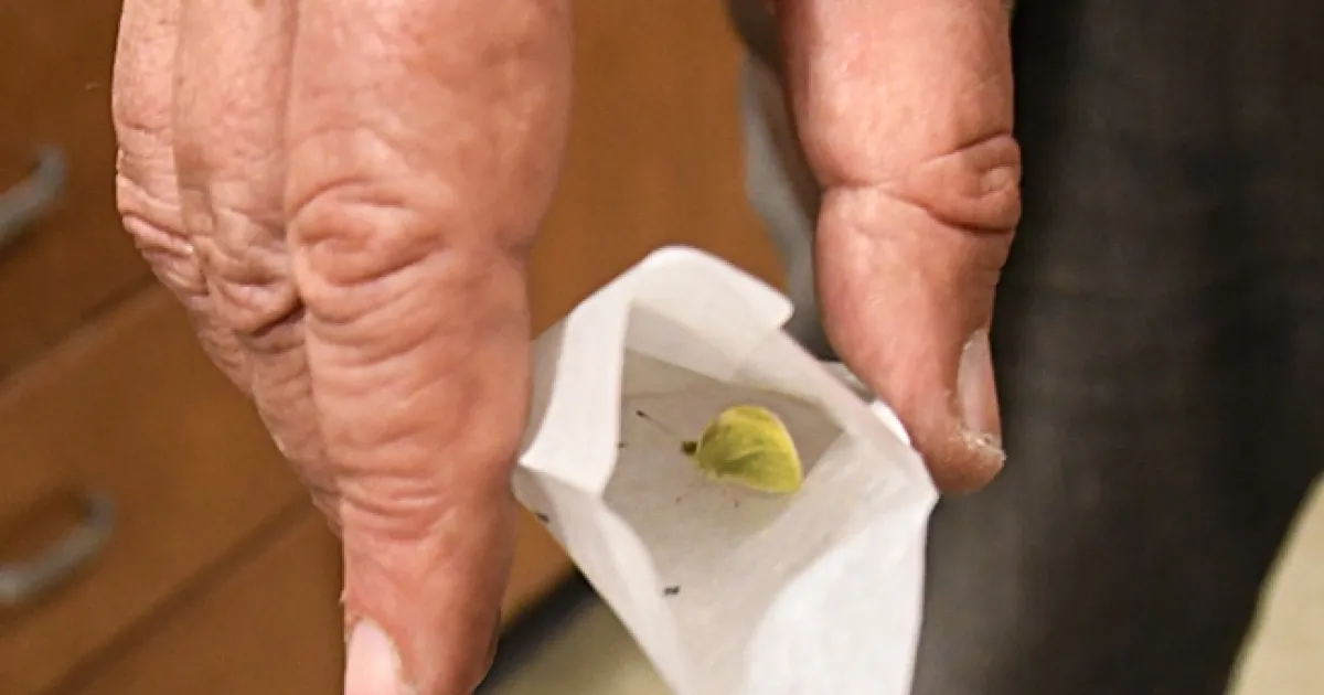Art Shapiro, UC Davis distinguished professor of evolution and ecology, holds a glassine envelope containing the winner of the 2019 Beer-for-a-Butterfly Contest. (Photo by Kathy Keatley Garvey)
