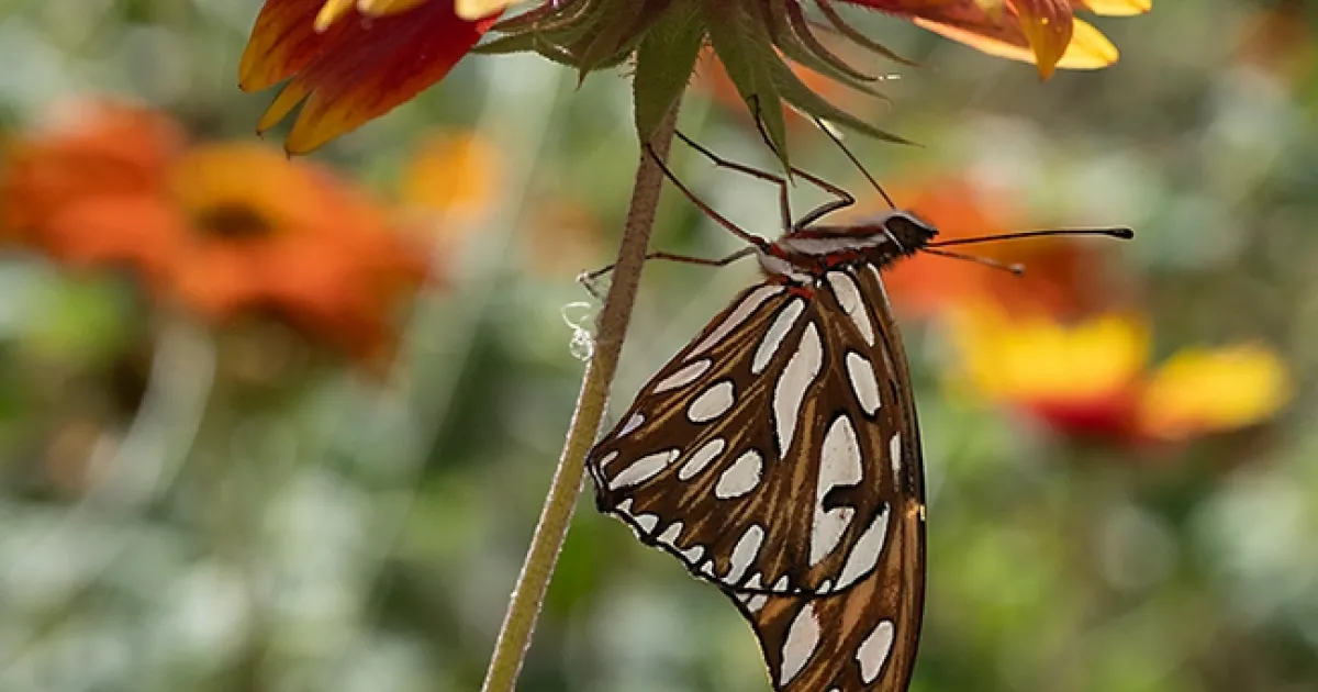 If you're lucky, you'll see a last-of-the-season Gulf Fritillary, Agraulis vanillae, hanging from the blossom, its silver-spangled underwings sparkling.