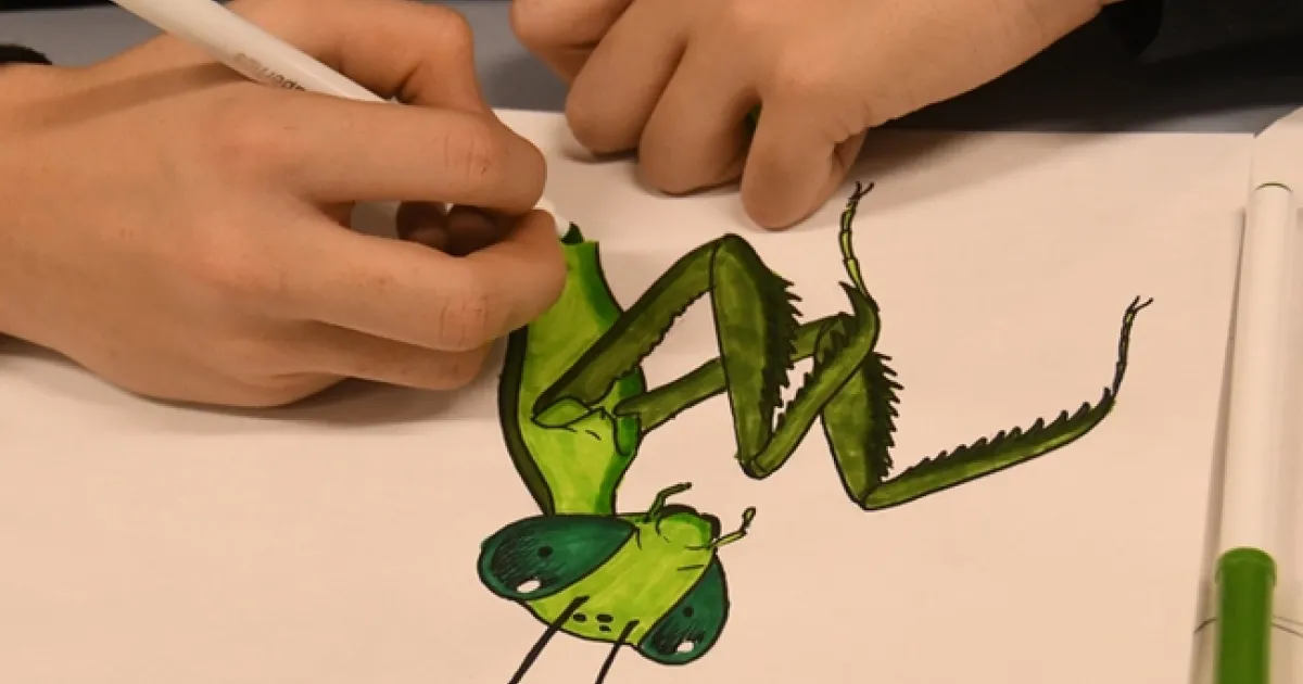 Using green and black markers, James Harris, 13, of Winters colored Merritt's drawing of a praying mantis as his father, Rick Harris, watched. No stranger to the campus, Rick Harris received his master's degree in systematic entomology from UC Davis, studying with major professor Robbin Thorp, distinguished emeritus professor of entomology. One of Rick's classmates was Lynn Kimsey, now director of the Bohart Museum of Entomology and professor of entomology.