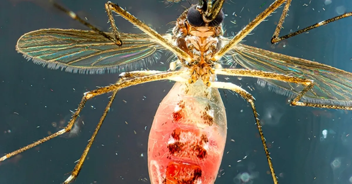 A blood-fed Aedes aegypti mosquito, photographed by medical entomologist/geneticist Geoffrey Attardo.