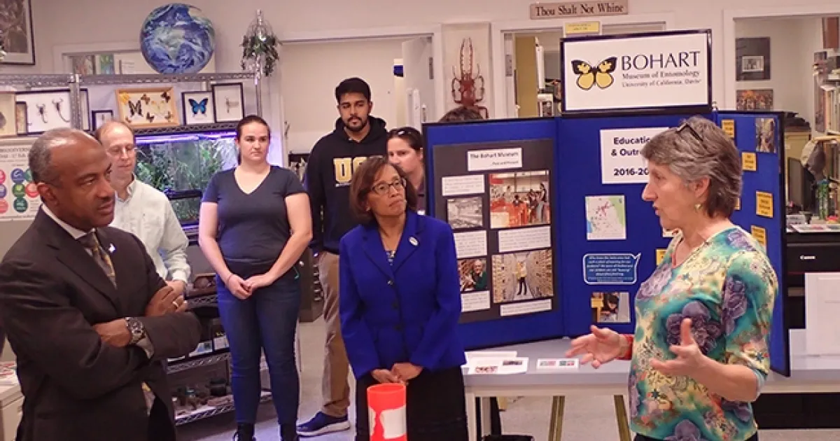 This was his first official visit to the Bohart Museum, a world-renowned museum that's part of the UC Davis Department of Entomology and Nematology. Those welcoming the UC Davis administrators included Bohart Museum director Lynn Kimsey, UC Davis professor of entomology; Steve Nadler, chair of the UC Davis Department of Entomology and Nematology; senior museum scientist Steve Heydon; Tabatha Yang, the museum's education and outreach coordinator; and Jeff Smith, curator of the butterfly and moth collection.