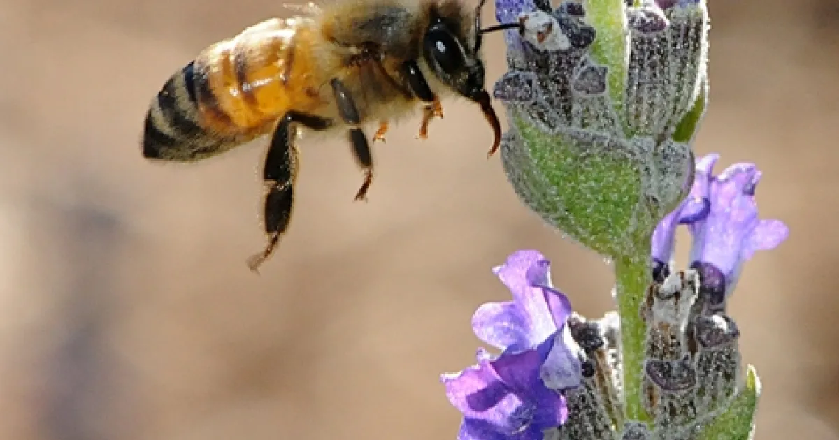 TONGUE EXTENDED in anticipation of nectar, a honey bee heads for lavender. Using the Pavlov dog method, bees can be trained to stick out their tongue, or proboscis, when they smell explosives. (Photo by Kathy Keatley Garvey)