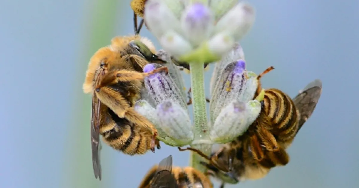 These males are longhorned digger bees, Melissodes agilis, sleeping on a lavender stem. (Photo by Kathy Keatley Garvey)