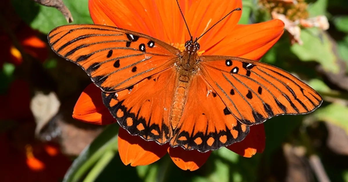 So, this seems like a good time to post an archived image of a bright spot in the garden, a Gulf Fritillary (Agraulis vanillae) nectaring on a Mexican sunflower (Tithonia rotundifola).