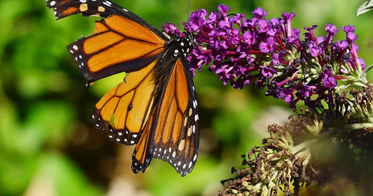 Broken-winged monarch sips nectar from a butterfly bush. (Photo by Kathy Keatley Garvey)