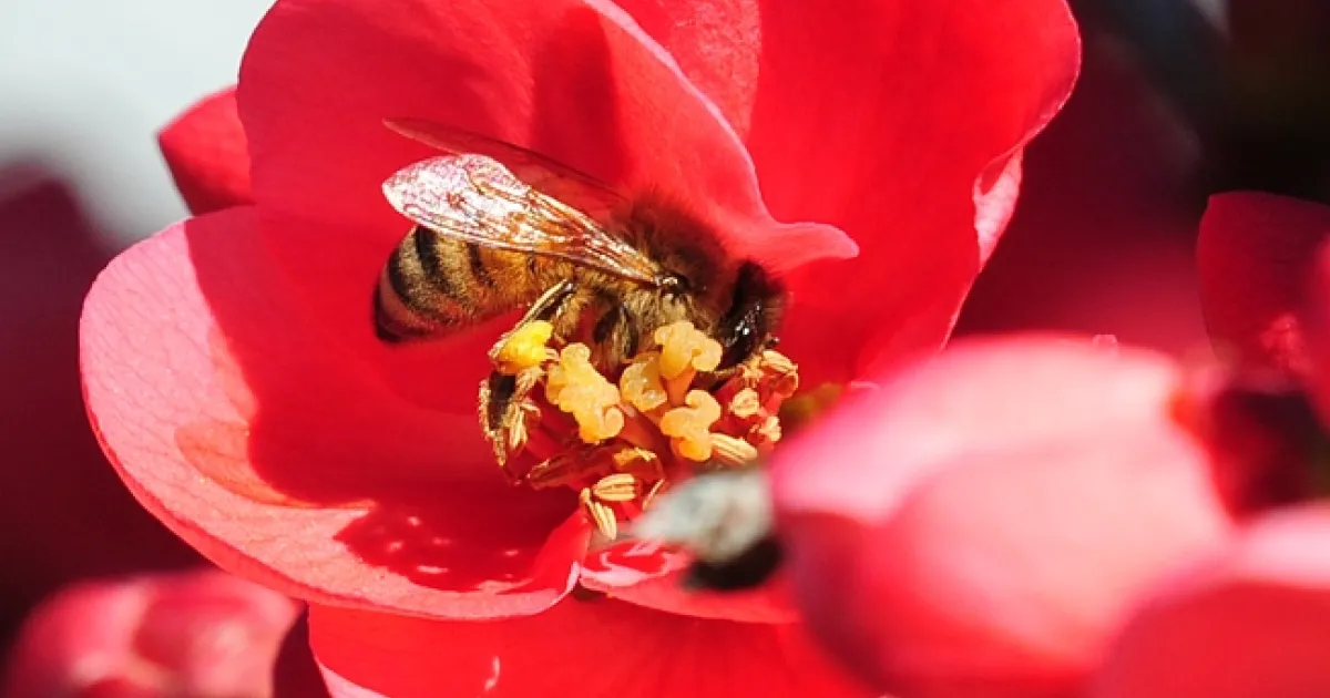When the honey bee meets the flowering quince, the bee is "the belle of the ball."