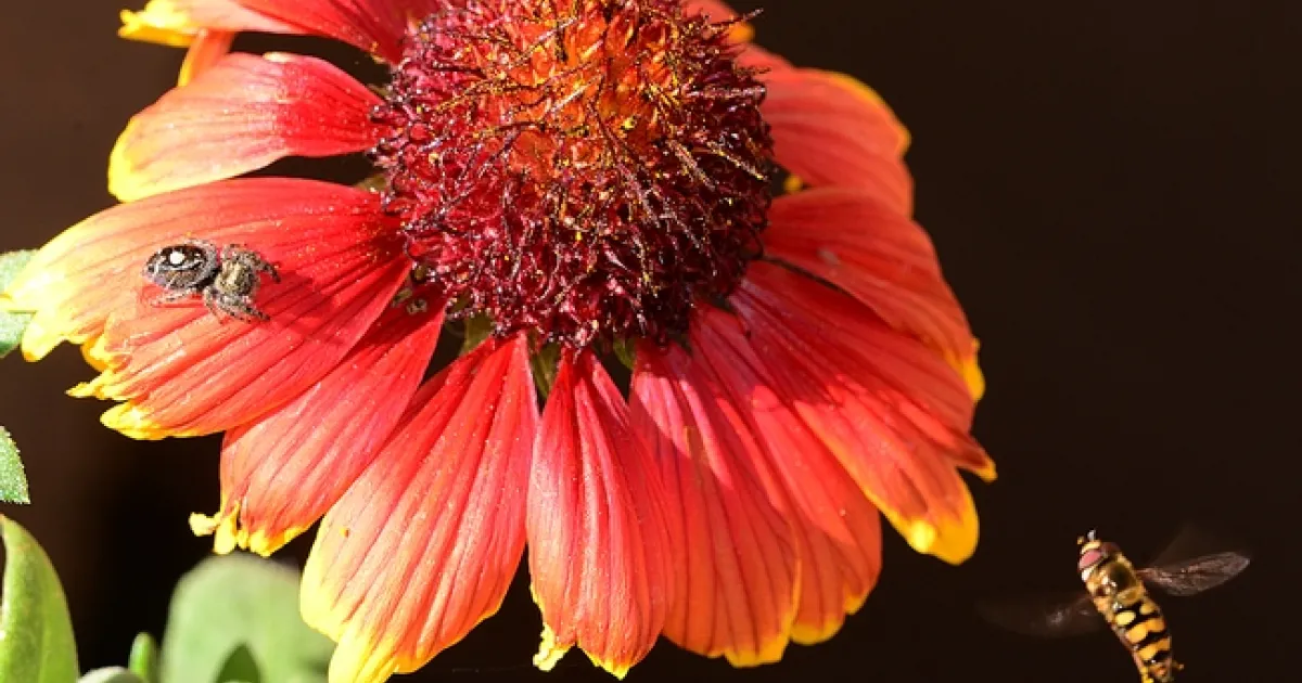 Anyway, this syrphid touched down on the blossom to sip nectar, its wings glinting in the early morning sun. Finally, it spotted the danger, a jumping spider lurking on the other side. The crafty predator lunged. Missed!