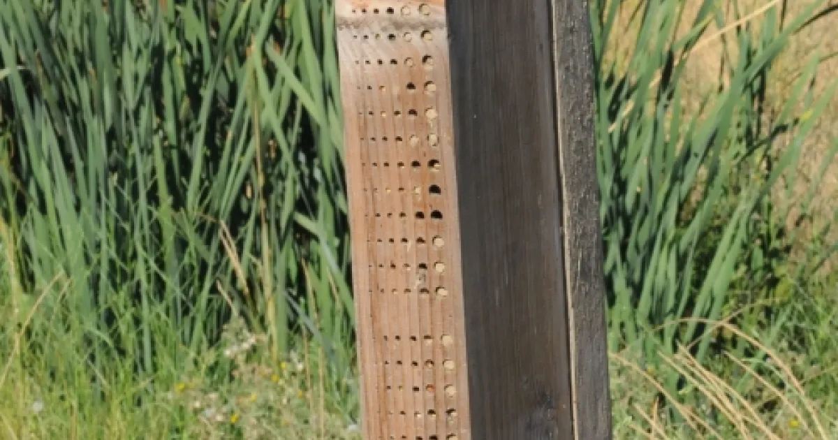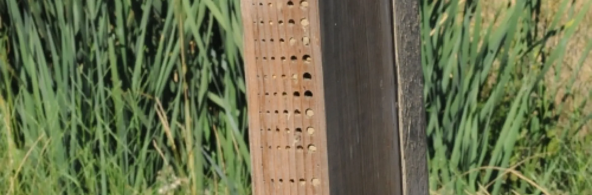 It's an artificial nesting site made of wood and drilled with different-sized holes and depths to accommodate the diversity of native pollinators. Often the bee block is nailed to a fence post. Native bees, such as leafminer bees and blue orchard bees, build their nests inside the holes.