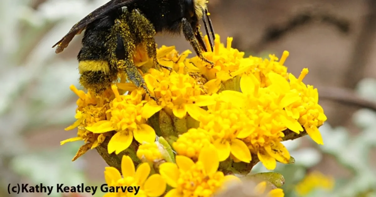 This yellow-faced bumble bee is packing red pollen. (Photo by Kathy Keatley Garvey)