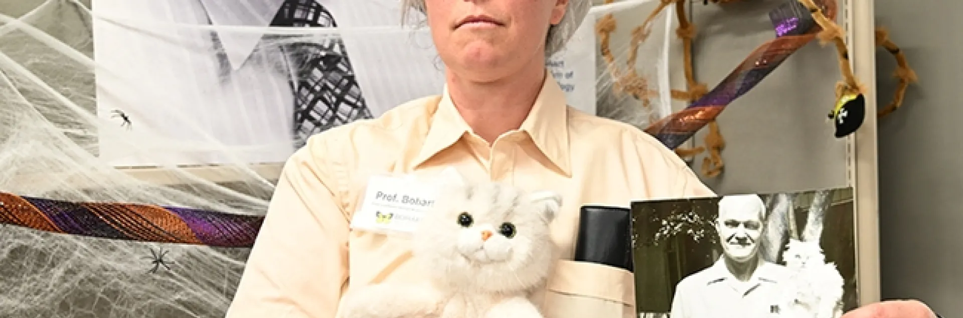 Yang wore a white lab coat with a "Doc" Bohart name-tag, with "Beau" securely fastened in front of her.