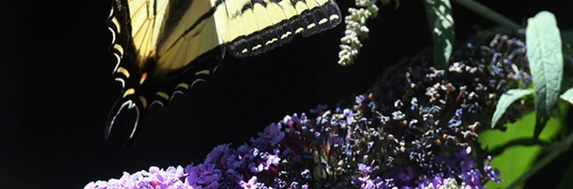 The yellow and black butterfly contrasts well on the purple blossoms of Buddleja davidii.