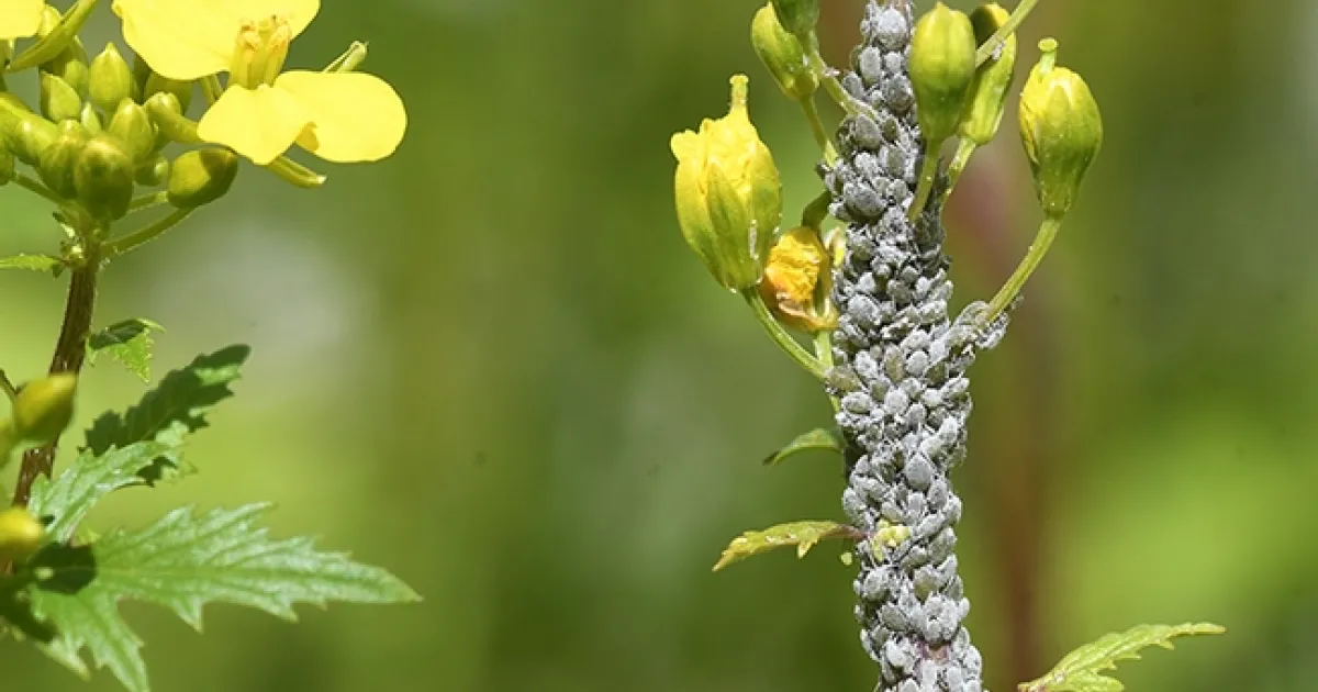 Close-up of cabbage aphids, Brevicoryne brassicae, on yellow mustard. (Photo by Kathy Keatley Garvey)