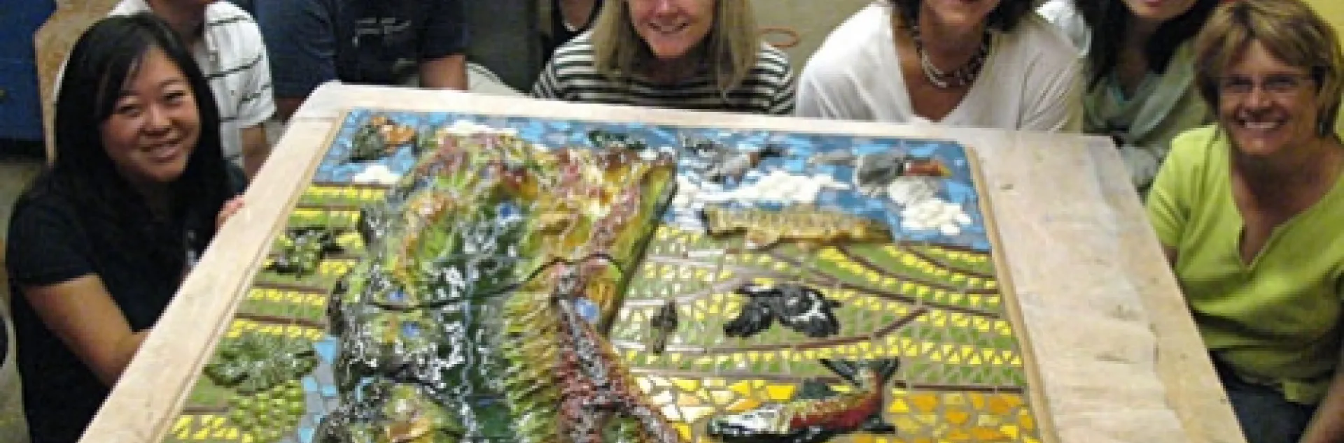 "California's Gold" is a 3x5-foot ceramic mosaic of the state, depicting California's flora and fauna, including the California poppy, quail, trout and salmon, as well as some of our major agriculture crops--dairy cows, honey bees, almonds, grapes, garlic and olives.