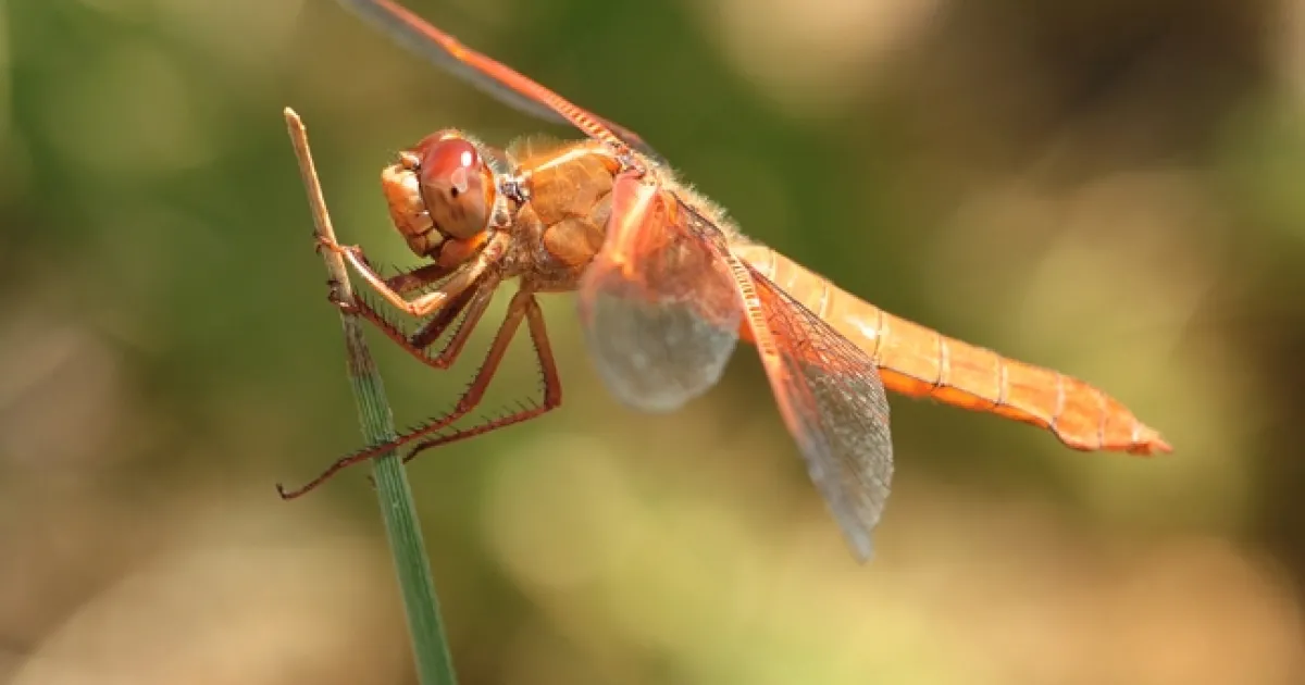 The flame skimmer dragonfly (Libellula saturata) owned a perch on a bamboo stake last Tuesday in residential Davis.