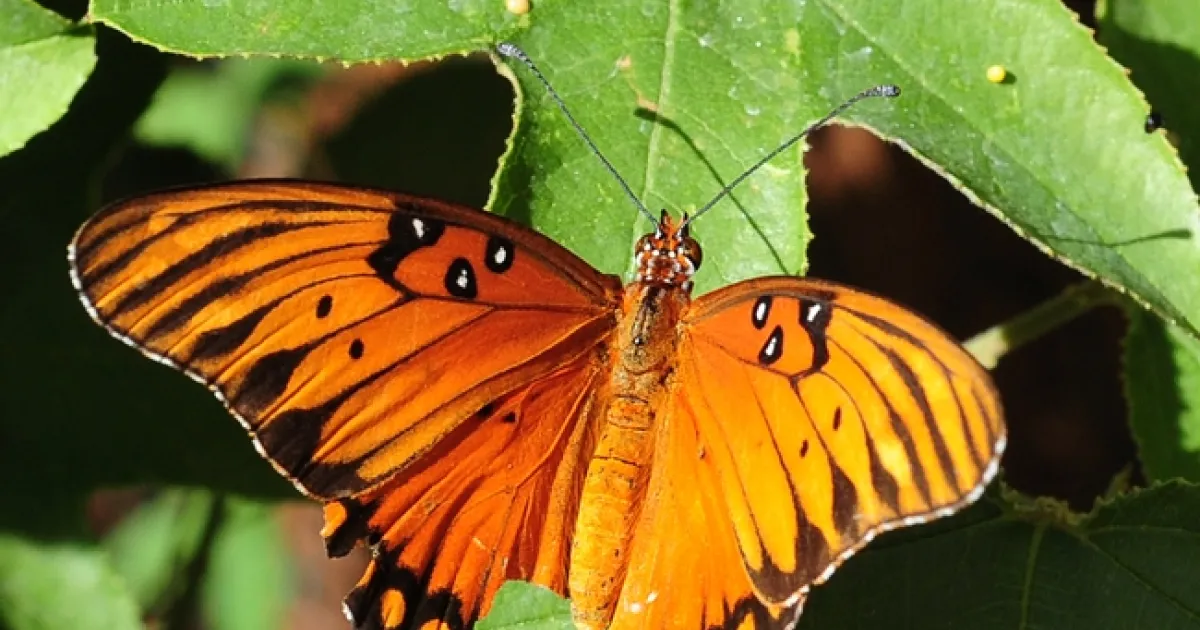 This particular Gulf Fritillary landed on its host plant, a passion flower vine (Passiflora) last Sunday and then fluttered off, only to be replaced by scores of others. They were laying eggs on the plant.