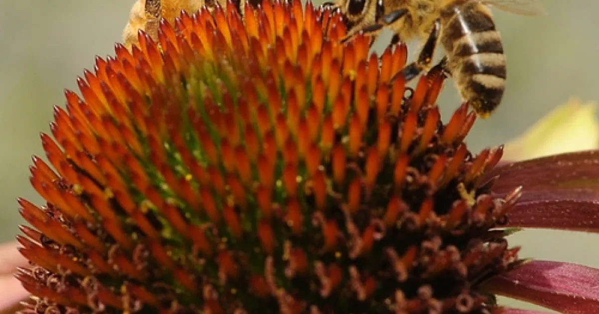 CLOSE-UP of an Italian bee and a New World Carniolan sharing a purple coneflower. (Photo by Kathy Keatley Garvey)
