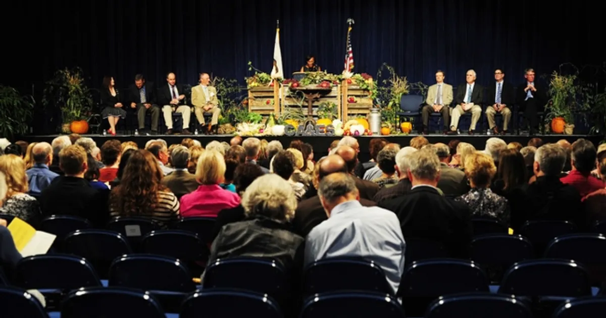 Smith sat on stage with the other 2015 recipients:  Jacqueline Beckley, Chuck Nichols and Tony Smith, alumni awards; Chris van Kessel, faculty; David Ginsburg, staff, and John Meyer, friend.