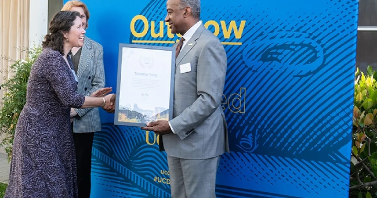 On April 29, Tabatha Yang was at UC Davis Chancellor Gary May's residence to accept the Chancellor's Outstanding Staff Award for Exceptional University Management and Exceptional University Impact with 11 other outstanding staff.