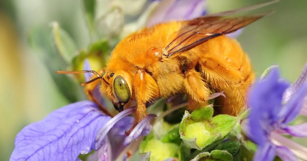 An apt description, to be sure. It's gold with green eyes and is often mistaken for "a golden bumble bee." It isn't. It's a carpenter bee. The female of the species is solid black.