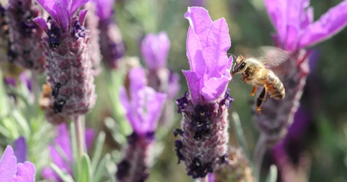 But have you ever seen honey bees working the Spanish lavender (Lavandula stoechas)? The bees seem to be dancing the Flamenco, partnering with the purple spiked blossoms.
